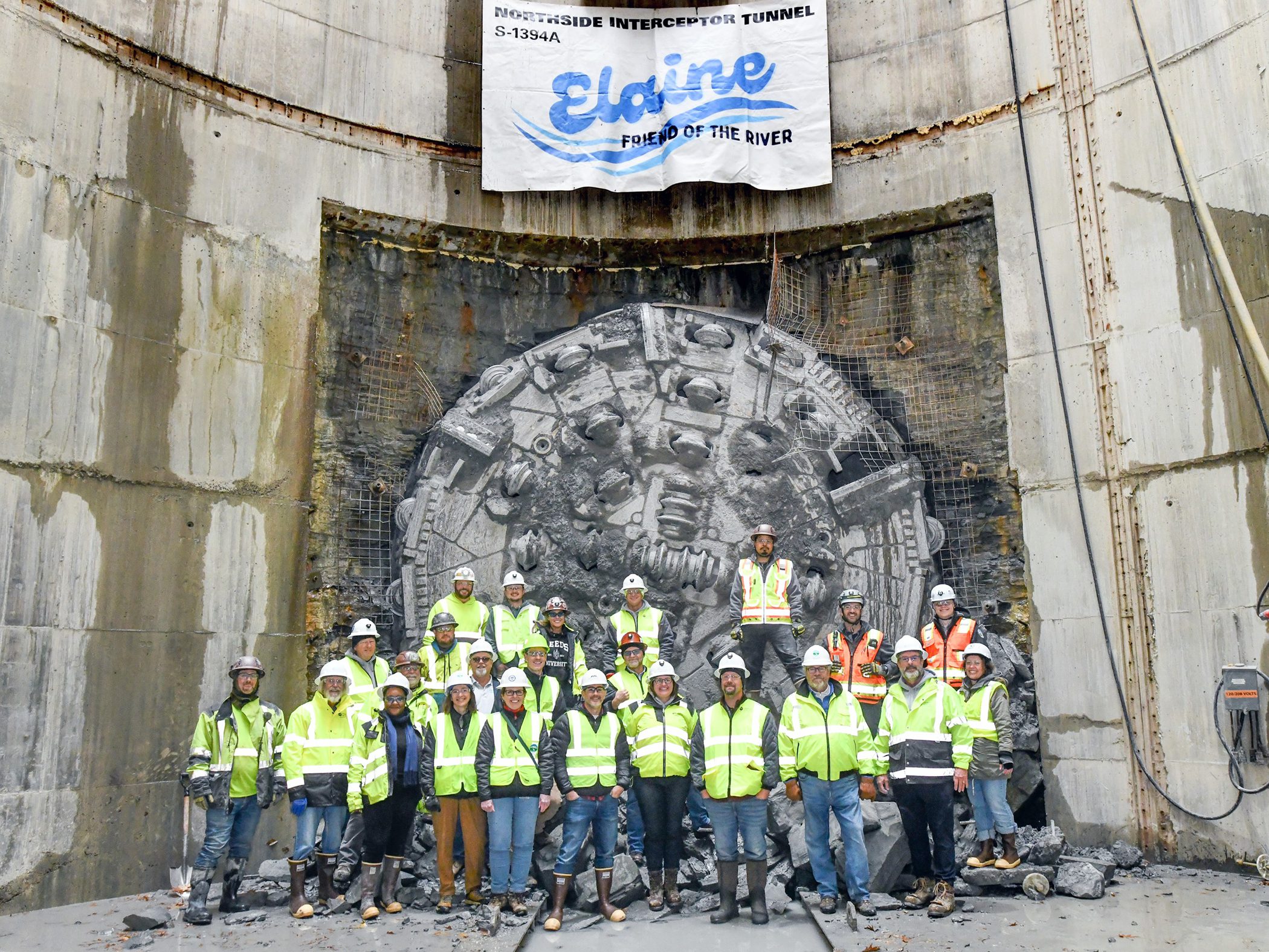 Crews are shown with Akron’s Northside Interceptor Tunnel boring machine, Elaine. Elaine created the second largest storage tunnel in the city to hold and convey combined sewage during heavy rain events until it